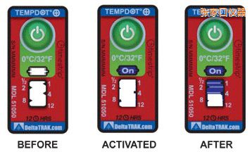TempDot™Plus標(biāo)簽應(yīng)存儲(chǔ)在室溫下,并必須在反應(yīng)溫度閾值以上被激活。激活是通過用手指推壓。"On"字出現(xiàn)在第一個(gè)窗口中顯示激活。之后5分 鐘內(nèi),,在反應(yīng)溫度或低于反應(yīng)溫度的情況下將標(biāo)簽貼到產(chǎn)品上。藍(lán)色染料熔化并以控制的速率遷移,,經(jīng)過白色大窗口。這表示暴露在溫度閾值以上的累計(jì)時(shí)間。當(dāng)溫 度低于閾值時(shí),該染料固化并停止移動(dòng)。如果溫度超過閾值,TempDot®Plus標(biāo)簽提供即時(shí)的視覺跡象。