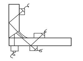 圖 2 角焊縫。綜合使用斜探頭、直探頭多面、多次探測。